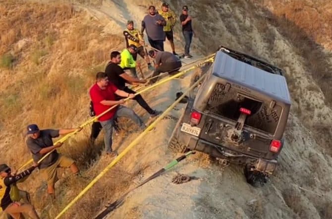 Seseorang yang sangat berani kemudian melompat ke belakang kemudi mobil dan dengan hati-hati memutar setir. Perlahan tapi pasti, Wrangler ditarik dari punggung bukit dan dikembalikan ke tempat yang aman.