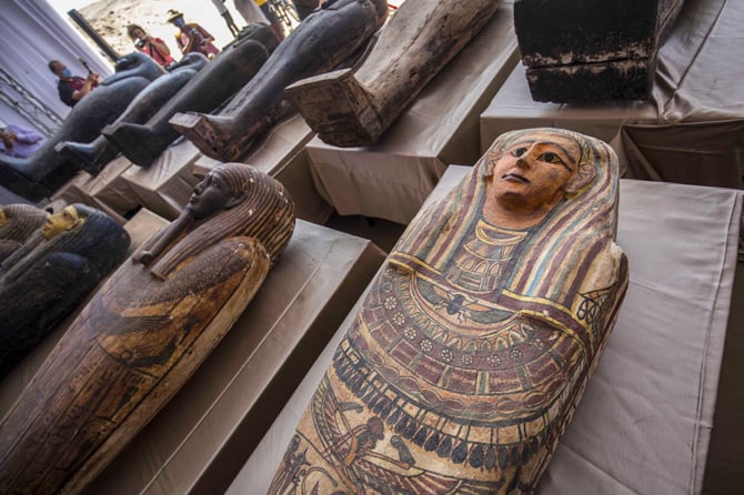 Sebagian dari 59 peti mati temuan tim arkeologi. Diperkirakan mumi telah terpendam di Saqqara lebih dari 2.500 tahun. (KHALED DESOUKI / AFP)