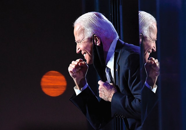SALAM KEMENANGAN: Gestur presiden terpilih AS Joe Biden jelang penyampaian pidato di Wilmington, Delaware, pada 7 November 2020, pasca dinyatakan sebagai pemenang pemilu AS. (Angela Weiss/AFP)
