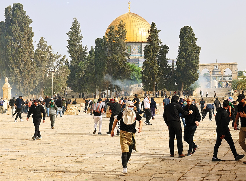 PERJUANGKAN HAK: Warga Palestina tetap bertahan di kawasan Masjidilaqsa meski diserang dengan tembakan gas air mata oleh tentara Israel. (AHMAD GHARABLI/AFP) - Image