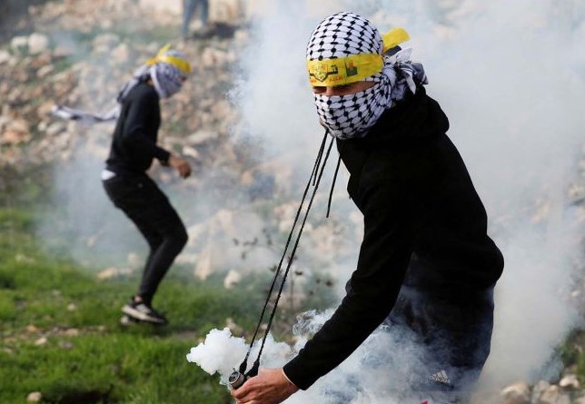 Seorang demonstran Palestina melemparkan kembali gas air mata yang ditembakkan pasukan Israel. Mohamad Torokman/Reuters/Antara