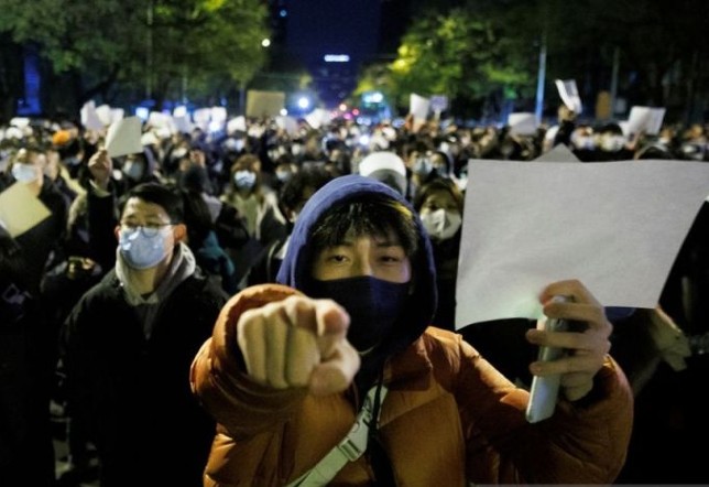 Orang-orang memegang lembaran kertas putih sebagai protes atas pembatasan Covid-19 di Tiongkok. Thomas Peter/Reuters/Antara