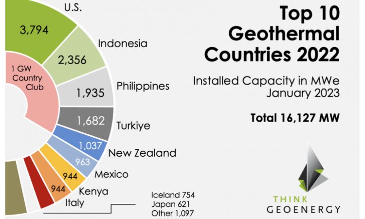 Berdasarkan data yang dirilis ThinkGeoEnergy yang dikutip JawaPos.com pada Senin (13/11), kapasitas terpasang pembangkit listrik tenaga panas bumi (PLTP) di seluruh dunia mencapai 16.127 MW pada akhir tahun 2022.