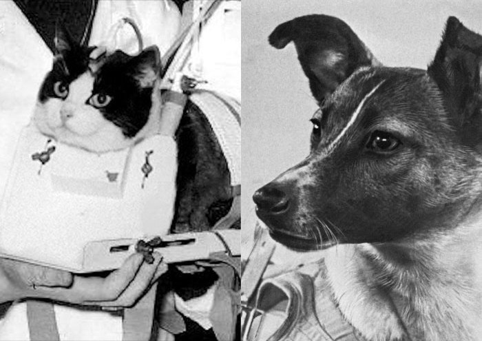 Gambar Felicite kucing pertama dan Laika anjing pertama di luar angkasa.