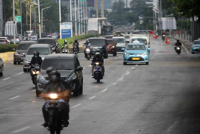 Sejumlah pengendara sepeda motor melintas di Jalan MH. Thamrin, Jakarta, Kamis (12/6/2020). Pemerintah Provinsi (Pemprov) DKI Jakarta berencana menerapkan ganjil genap bagi sepeda motor pribadi. Di mana penerapan ganjil genap sepeda motor itu pada PSBB Tr