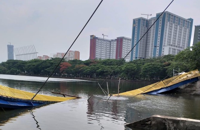 Jembatan gantung yang terbentang di atas permukaan air itu merupakan salah satu fasilitas Kawasan Hutan Kemayoran yang berdiri di atas lahan seluas 22,3 hektare. Pusat Pengelola Kompleks Kemayoran (PPKK) masih melakukan investigasi terkait robohnya jembatan gantung tersebut.