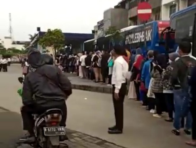 JawaPos.com - Penumpukan penumpang di halte Transjakarta terjadi disejumlah titik. Masyarakat yang masih bekerja ke kantor di tengah mewabahnya virus korona (COVID-19) pun terpaksa harus mengantri lama untuk mendapat transportasi umum.