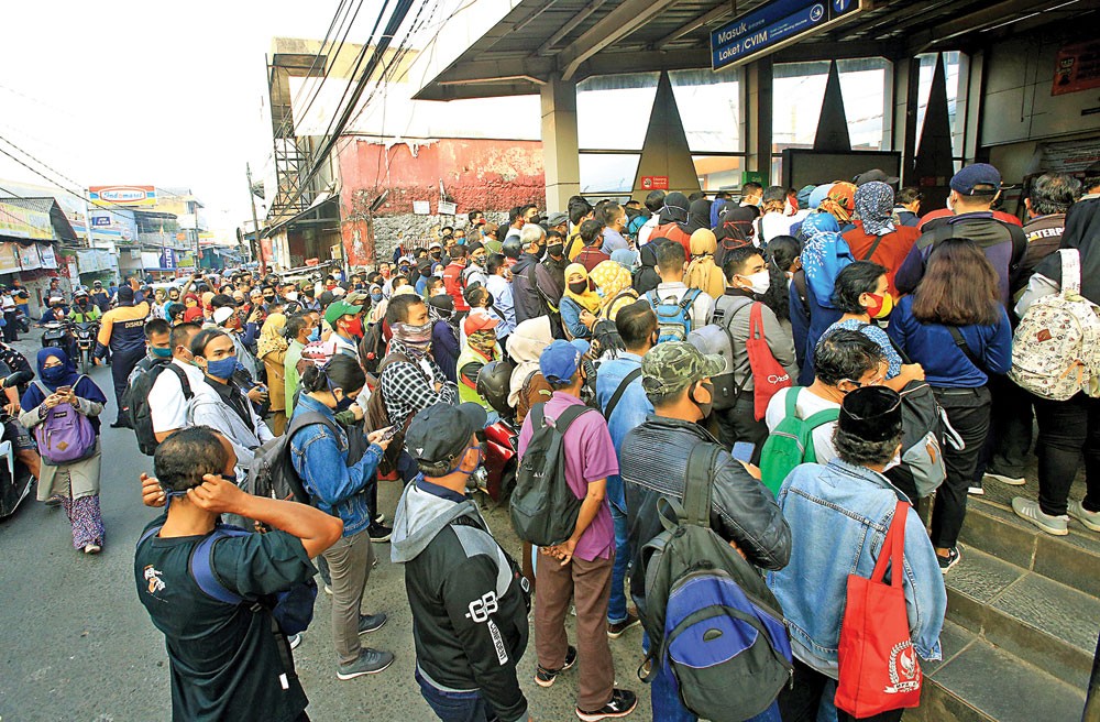 TANPA JARAK: Calon penumpang KRL Commuterline antre menuju pintu masuk Stasiun Citayam, Depok, Jawa Barat, kemarin (8/6). (MIFTAHUHAYAT/JAWA POS)