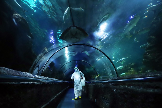 Petugas saat menyemprotkan cairan disinfektan ke kaca aquarium Sea Word, Ancol, Jakarta, Sabtu (14/3/2020). Taman Impian Jaya Ancol ditutup selama dua pekan ke depan terkait antisipasi virus corona itu. Foto: Dery Ridwansah/ JawaPos.com