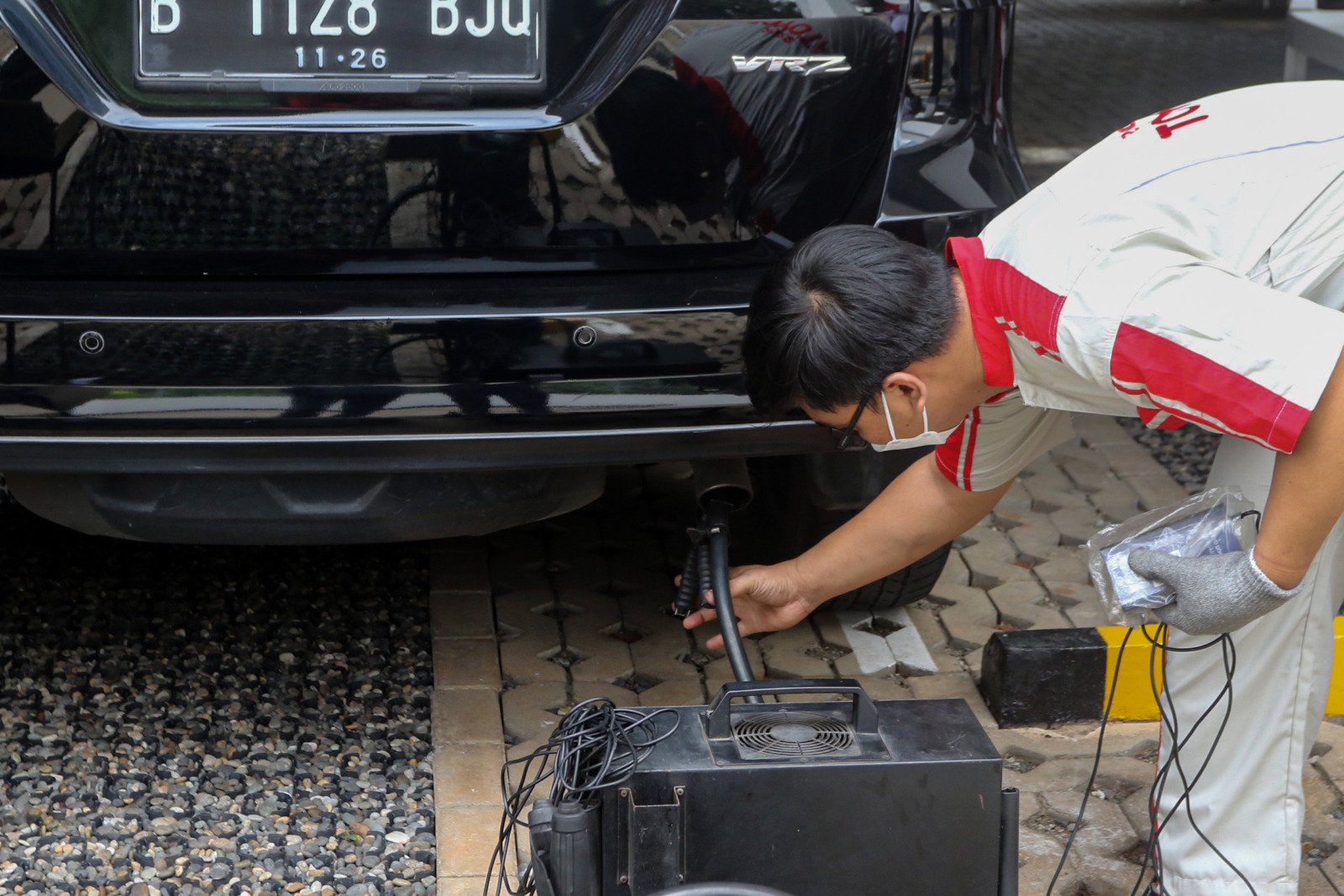 Petugas melakukan uji emisi Garda Oto pada kegiatan Estafet Peduli Bumi di kawasan perkantoran Asuransi Astra, Jakarta, Minggu (11/12/2022). Asuransi Astra kembali bergerak dalam upayanya menekan tingkat polusi udara demi memberikan peace of mind kepada m