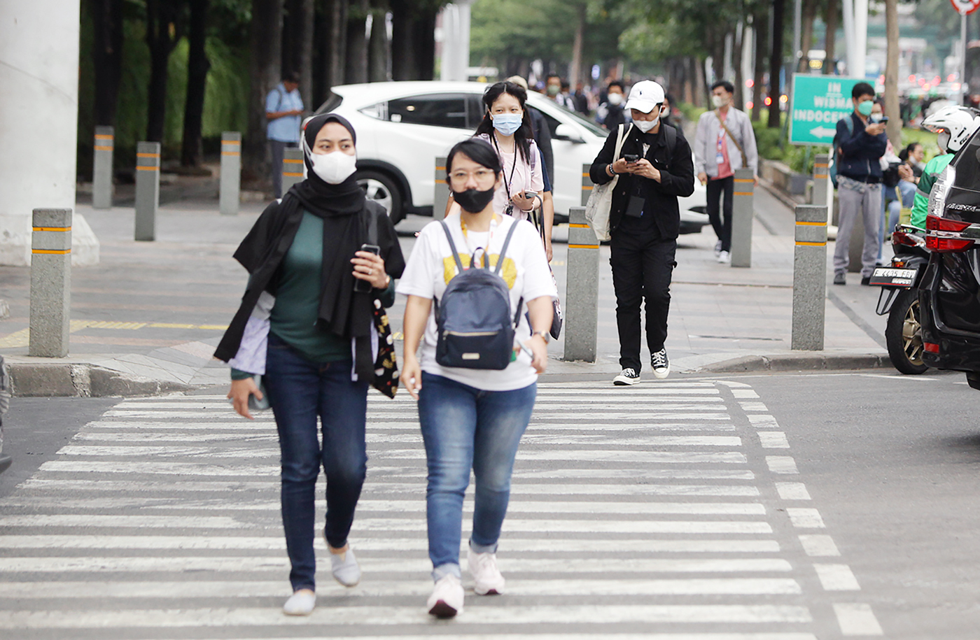 Lalu-lalang pekerja berjalan mengunakan masker untuk menghindari polusi udara sepulang di kawasan Jalan Sudirman-Thamrin, Jakarta, Jumat (25/8/2023).