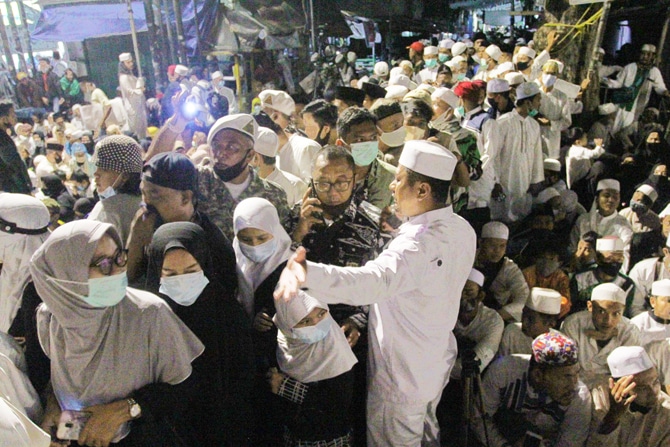 Ratusan Jamaah memadati Jl KS Tubun, Petamburan, Jakarta, Sabtu (14/11/2020). Jamaah berdatangan untuk mengikuti acara Maulid Nabi Muhammad SAW dan akad nikah anak dari Imam Besar Front Pembela Islam (FPI) Habib Rizieq Shihab yakni Syarifah Najwa Shihab.