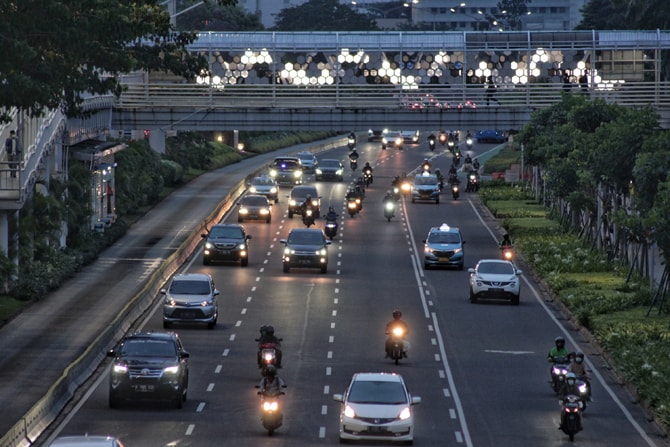 Lalu lintas kendaraan yang melintas di jalan Sudirman, Jakarta, Selasa (19/01). Provinsi DKI Jakarta keluar dari daftar 10 kota termacet di dunia versi lembaga TomTom Traffic Index. Berdasarkan informasi yang dikutip dari situs TomTom Traffic Index, DKI J