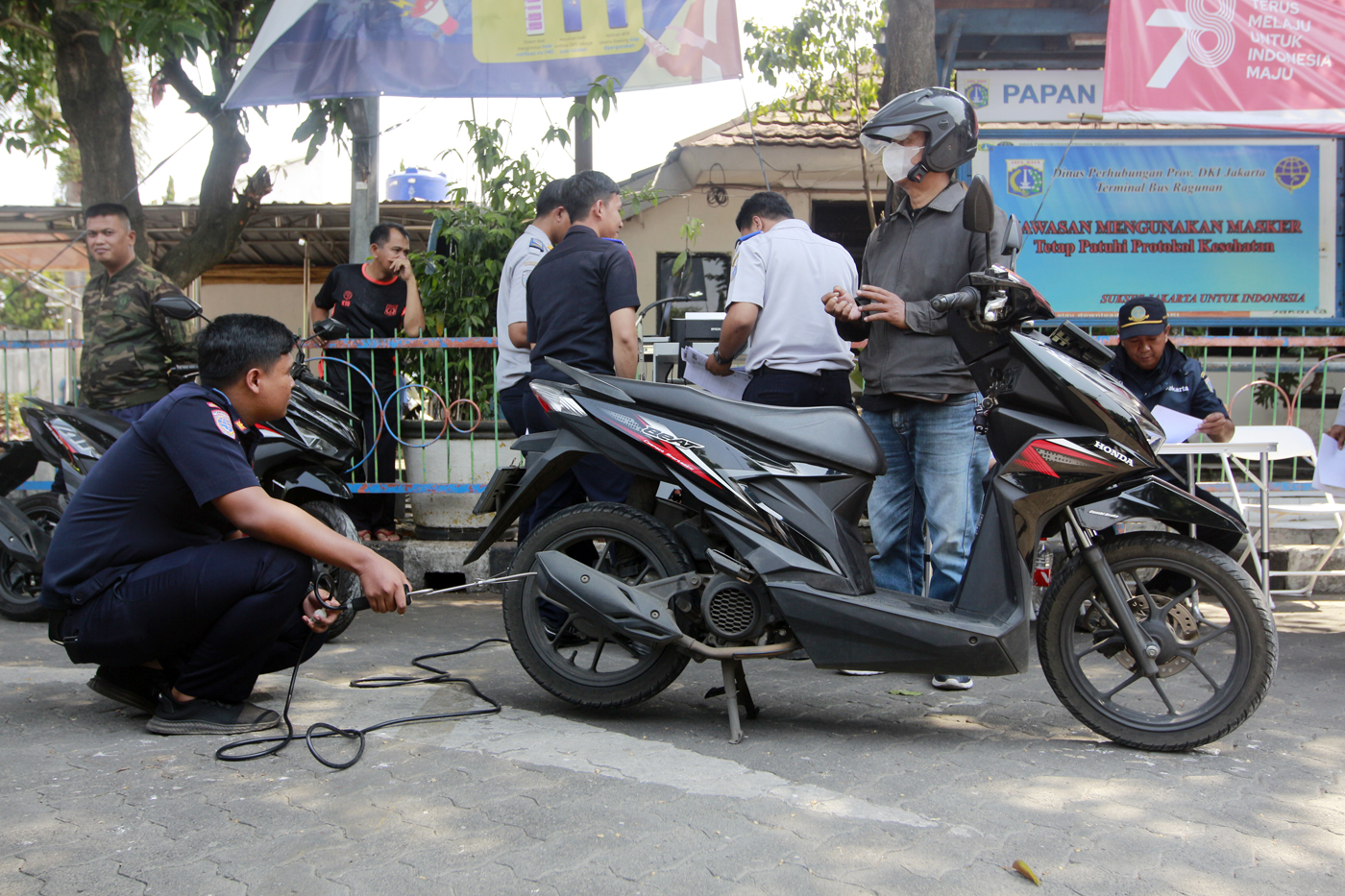 Petugas melakukan uji emisi kendaraan bermotor dengan alat uji secara gratis oleh Unit Pengelola Pengujian Kendaraan Bermotor (UP PKB) Jagakarsa di Terminal Bus Ragunan, Jalan Saco, Pasar Minggu, Jakarta Selatan, Rabu (27/9/2023).