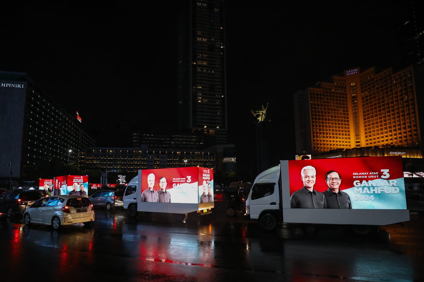 JawaPos.com - Sebanyak 10 unit truk videotron yang menampilkan Pasangan Calon Presiden Ganjar Pranowo dan Calon Wakil Presiden Mahfud MD pawai mengelilingi Bundaran Hotel Indonesia (HI) Jakarta. Pemandangan itu terlihat seusai acara pengundian nomor urut Capres-Cawapres di Kantor Komisi Pemilihan Umum (KPU) Republik Indonesia, Jakarta Pusat, Selasa (14/11) malam.
