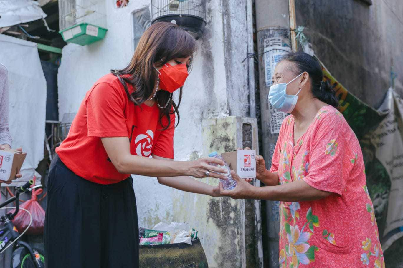 Plt Sekjen DPP PSI Dea Tunggaesti berbagi rice box di Cilincing, Jakarta Utara, Minggu (1/8). (Istimewa)