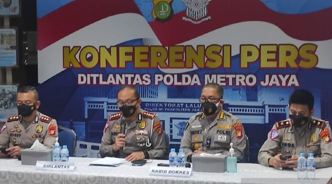 Direktur Lalu Lintas Polda Metro Jaya Kombespol Sambodo Purnomo Yogo (kedua kiri) memberikan keterangan terkait kasus kecelakaan tunggal yang menewaskan AKP Novandi Arya Kharizma, Selasa (8/2). Polda Metro Jaya/Antara
