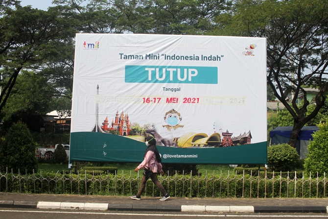 Pengunjung melintas didepan pengumuman penutupan sementara kawasan TMII di Jakarta, Minggu (16/5/2021). Pemprov DKI Jakarta memutuskan menutup sementara tempat wisata TMII, Ragunan dan Ancol hingga 17 Mei mendatang guna melakukan penguatan protokol keseha