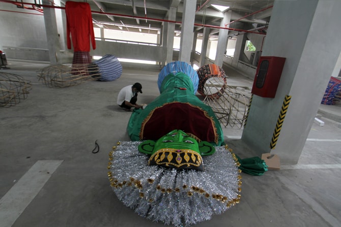 Pekerja saat menyelesaikan pembuatan ondel-ondel raksasa yang dipajang di pelataran Taman Ismail Marzuki, Jakarta, Selasa (22/6/2021). Sebanyak sepuluh ondel-ondel raksasa tersebut akan dipamerkan di depan Taman Ismail Marzuki dalam rangka memeriahkan per