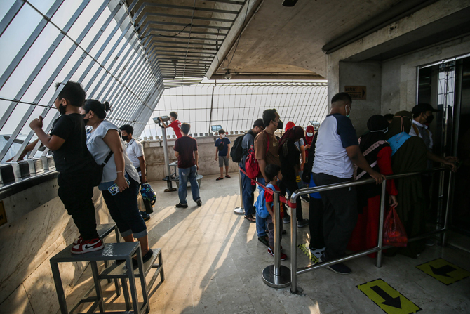 Pengunjung berada di Pelataran Puncak Monas, Jakarta, Sabtu (2/7/2022). Tempat wisata dan museum bersejarah nasional yakni kawasan dan Tugu Monas resmi dibuka kembali untuk umum pada Jumat 1 Juli 2022, ada lima tempat yang bisa dikunjungi oleh umum dian