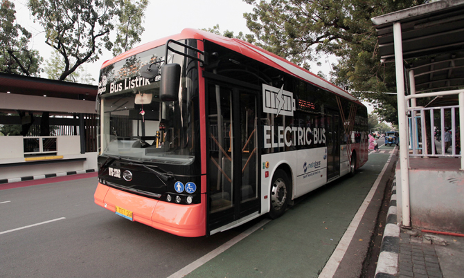 Bus Listrik Transjakarta saat membawa penumpang di halte Balai Kota, Jakarta, Rabu (21/9/2022). Pemprov DKI Jakarta melalui PT Transjakarta menambah lebih dari 100 bus listrik Transjakarta pada 2023 yang antara lain untuk mendukung pelaksaan Program Langi