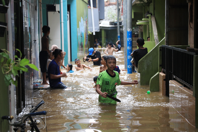 Ilustrasi: Sejumlah warga beraktivitas saat banjir merendam pemukiman di kawasan Kebon Pala, Kampung Melayu, Jatinegara, Jakarta Timur, Senin (8/11/2021). (Dok JawaPos.com)