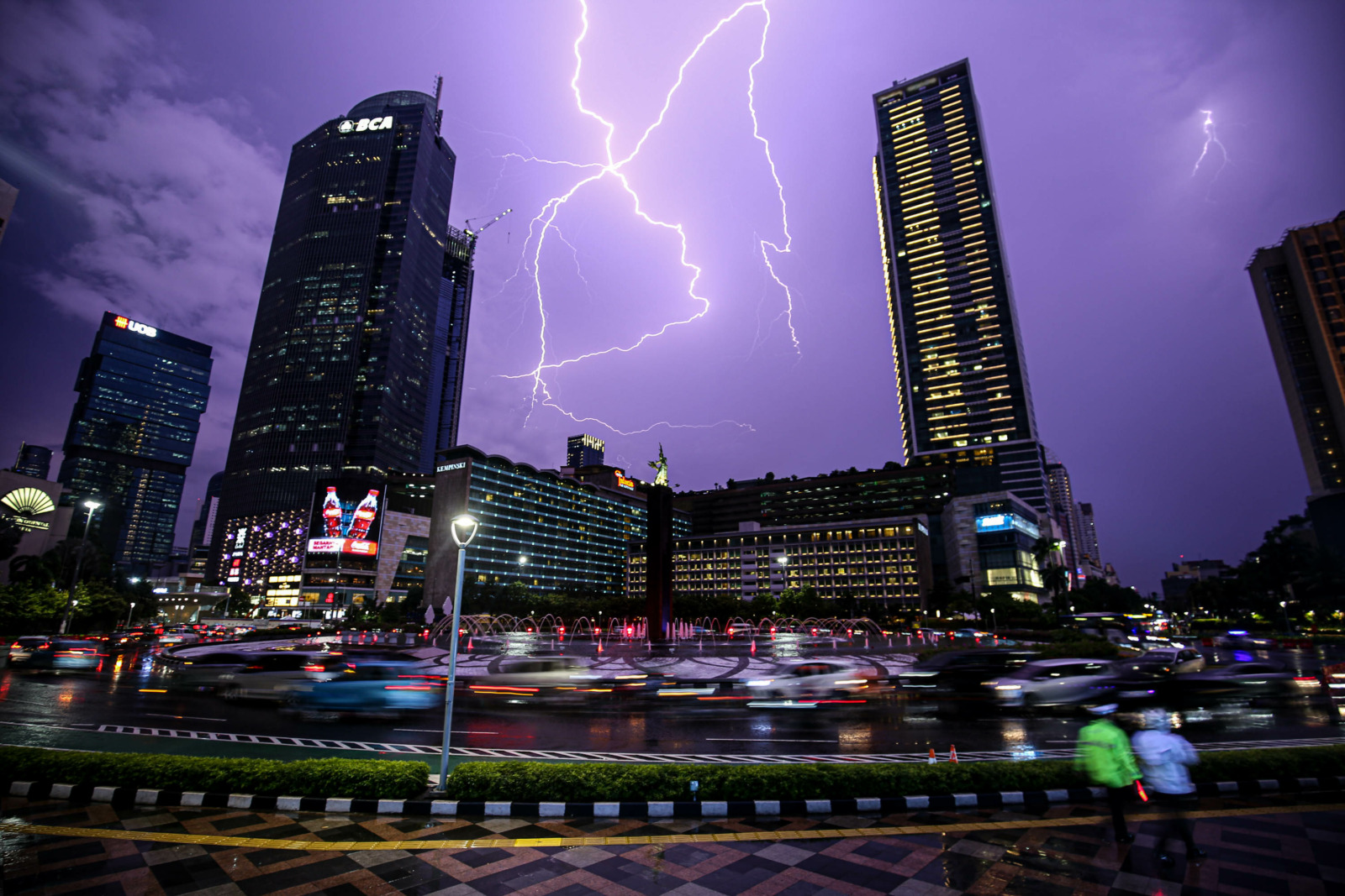 Petir menyambar saat hujan turun dikawasan Bundaran Hotel Indonesia Jakarta, Senin (28/11/2022). Menurut peringatan dini BMKG, 29 wilayah perlu waspada cuaca ekstrem hujan lebat disertai petir dan angin kencang. Tak hanya peringatan dini cuaca ekstrem, BM