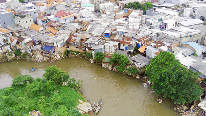 Suasana rumah padat penduduk di bantaran Sungai Ciliwung, Manggarai, Jakarta, Sabtu (12/11/2022). Pemerintah Provinsi DKI Jakarta menargetkan normalisasi Ciliwung sepanjang 4,8 kilometer pada 2023. Data dari Dinas SDA DKI Jakarta, normalisasi Ciliwung ha