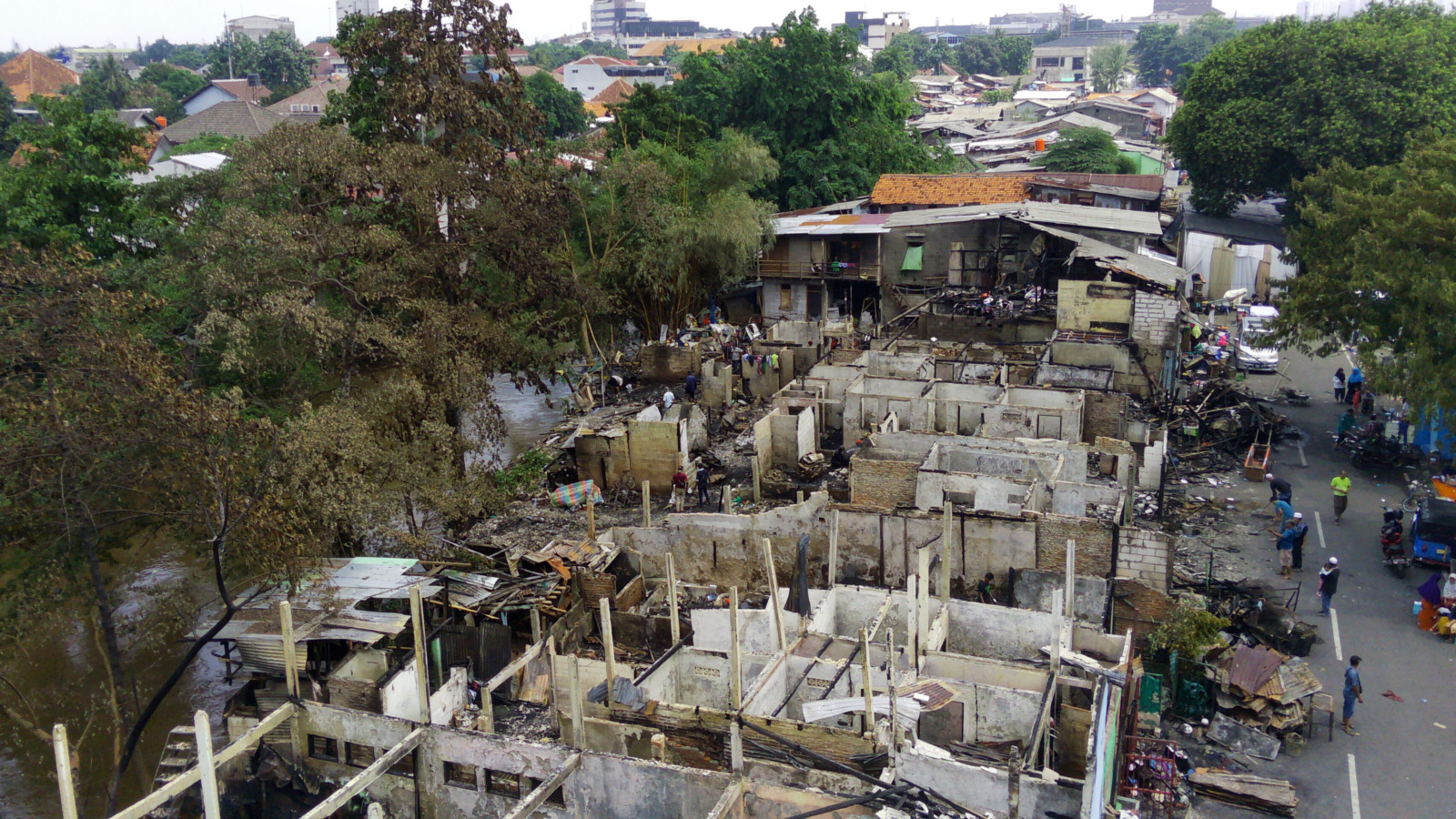 Foto udara terlihat puluhan bangunan rumah hangus terbakar terbakar di kawasan Manggarai, Jakarta, Minggu (18/12/2022). Kebakaran tersebut terjadi pada Sabtu sore tersebut terjadi akibat petir yang menyambar menyebabkan 52 rumah hangus terbakar. Foto: Der