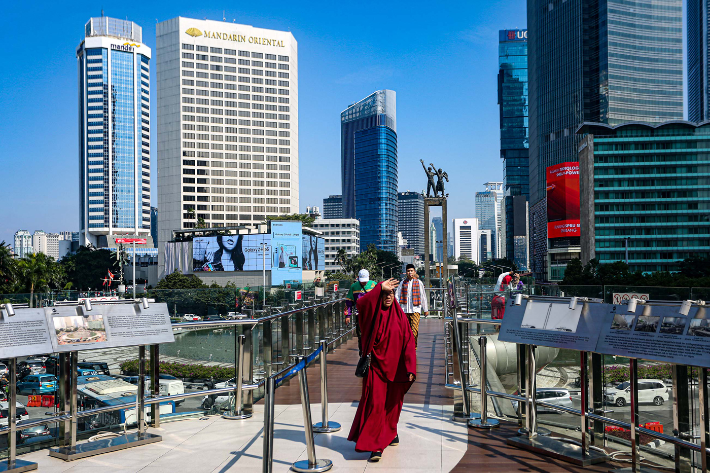 Warga beraktifitas dianjungan Transjakarta saat cuaca terik di kawasan Bundaran HI, Jakarta, Selasa (1/8/2023).