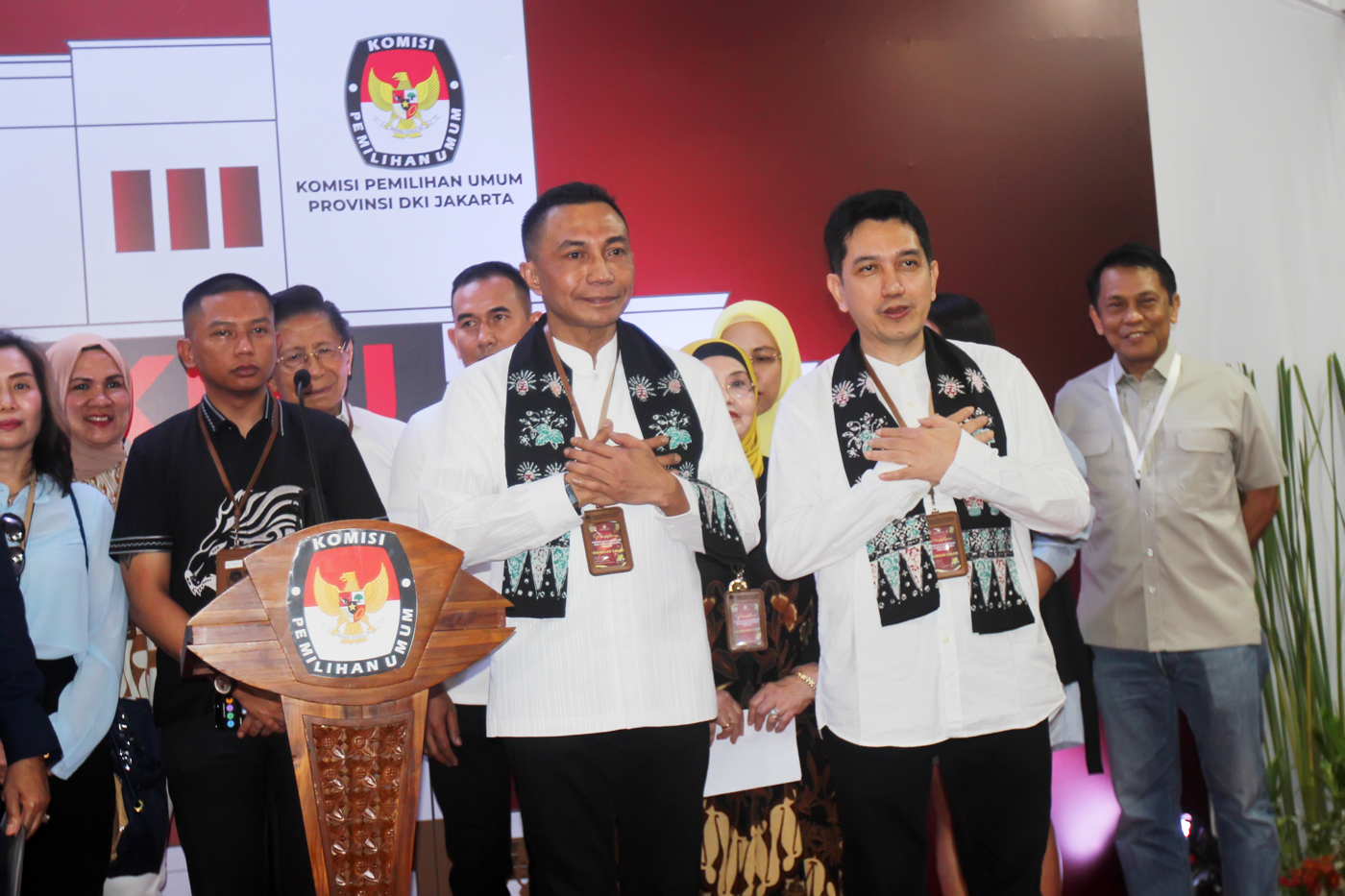 Pasangan bakal calon Gubernur dan Wakil Gubernur DKI Jakarta Dharma Pongrekun & Kun Wardana usai mendaftar Pilkada DKI Jakarta tahun 2024 di kantor KPU DKI Jakarta, Kamis (29/8/2024). (Dery Ridwansah/ JawaPos.com)