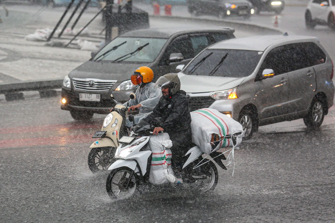 Sejumlah pengendara melewati kawasan Bundaran HI saat hujan melanda, Selasa (24/9/2024). (Miftahul Hayat/Jawa Pos)