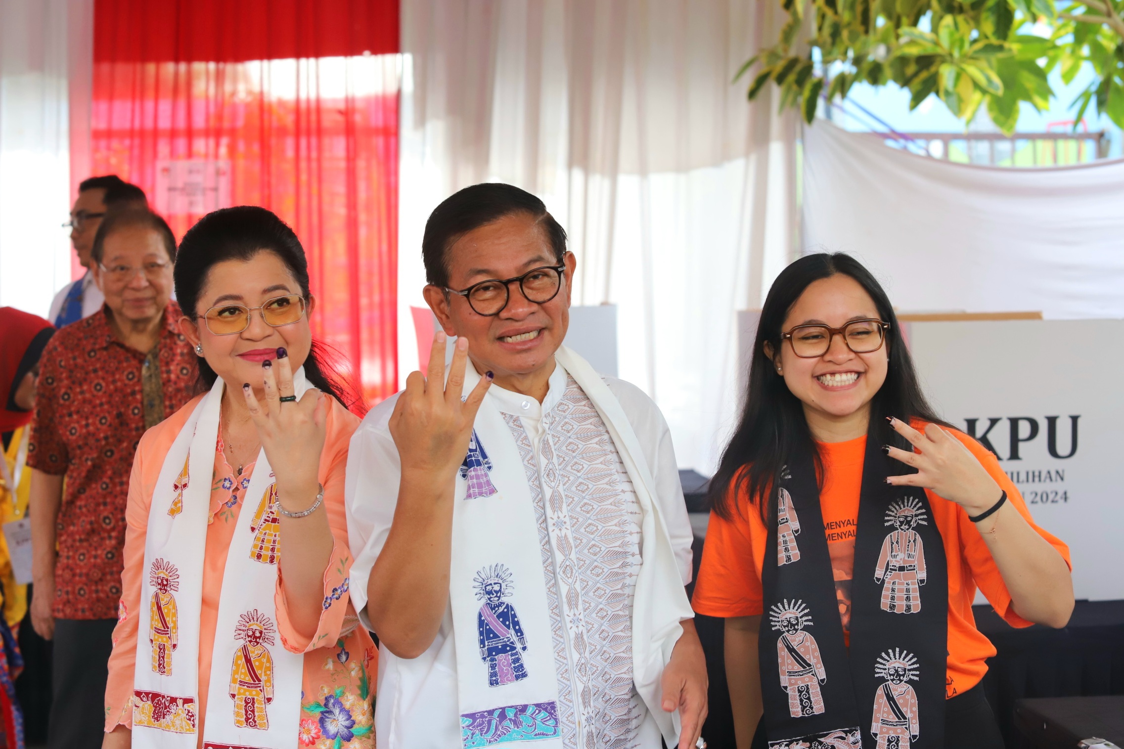 Calon Gubernur nomor urut 3 Pramono Anung bersama Istri dan anaknya menggunakan hak pilih dalam Pilkada Jakarta 2024 di TPS 046, Cipete Selatan, Jakarta, Rabu (27/11) (Dery Ridwansah/ JawaPos.com)