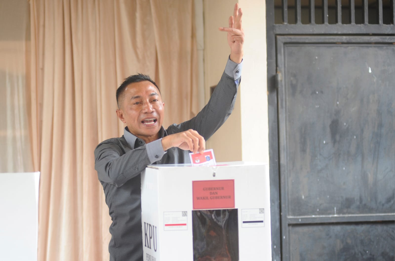 Calon Gubernur DKI Jakarta nomor urut 2 Dharma Pongrekun menggunakan hak pilihnya Pilkada di TPS 31 Lebak Bulus, Jakarta, Rabu (27/11/2024). (Dery Ridwansah/ JawaPos.com)