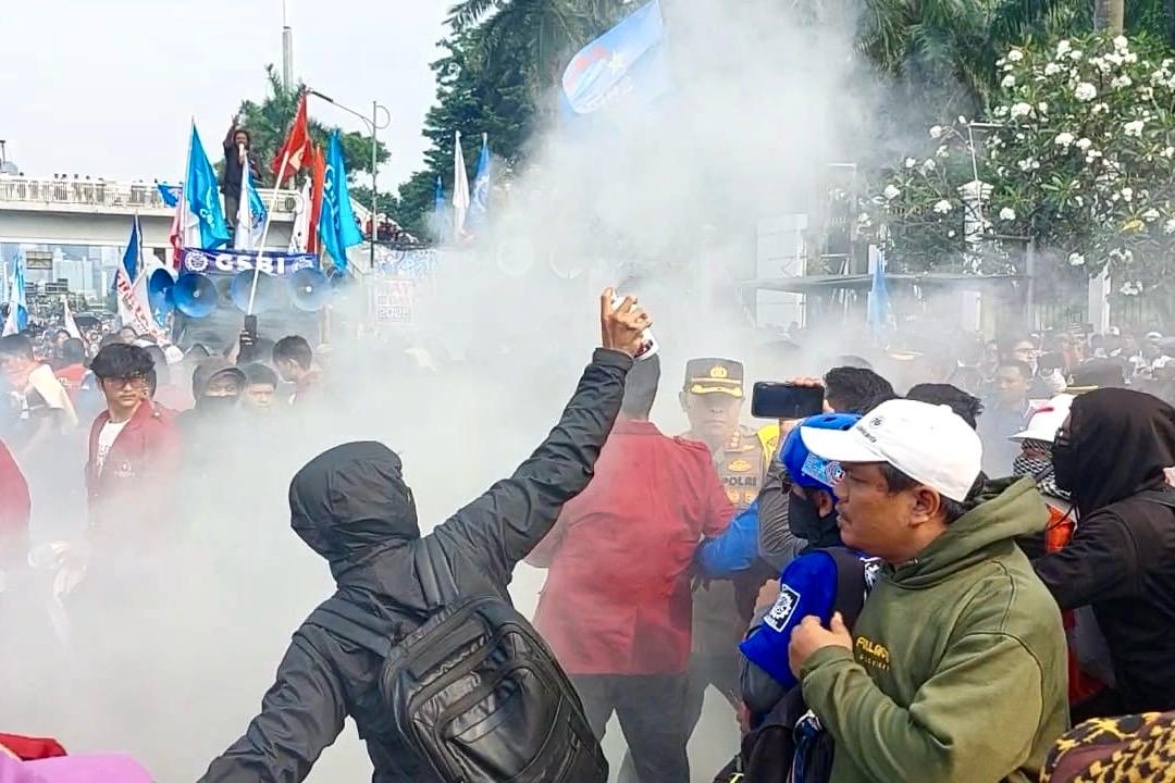 Kericuhan bermula ketika massa membakar ban tepat di depan gedung wakil rakyat. Tak lama, Kapolres Metro Jakarta Pusat Kombes Pol Susatyo Purnomo Condro bersama jajarannya langsung turun tangan.