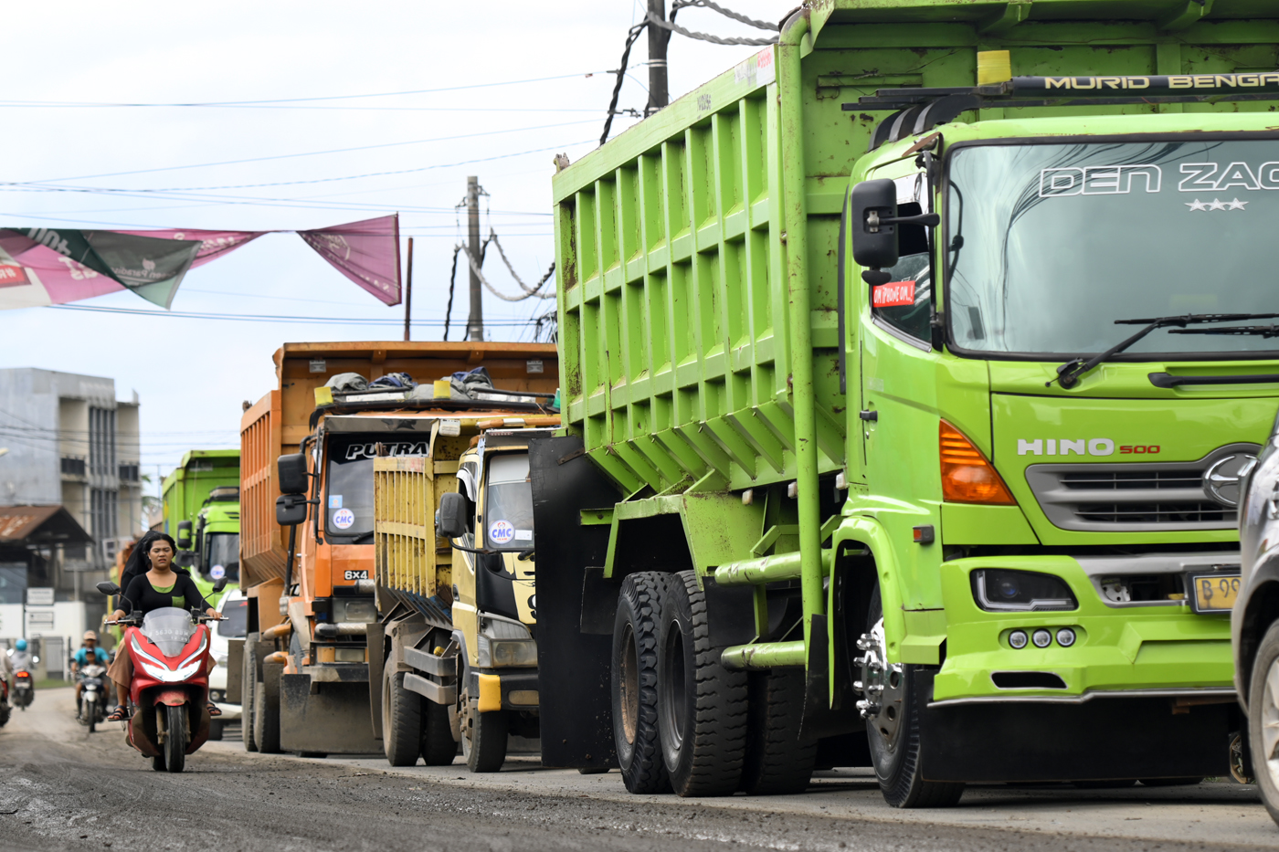 Pengendara sepeda motor melintas di samping truk yang mengantre untuk melintas di kawasan Parung Panjang, Kabupaten Bogor, Jawa Barat, Kamis (19/12/2024). (Dery Ridwansah/ JawaPos.com)