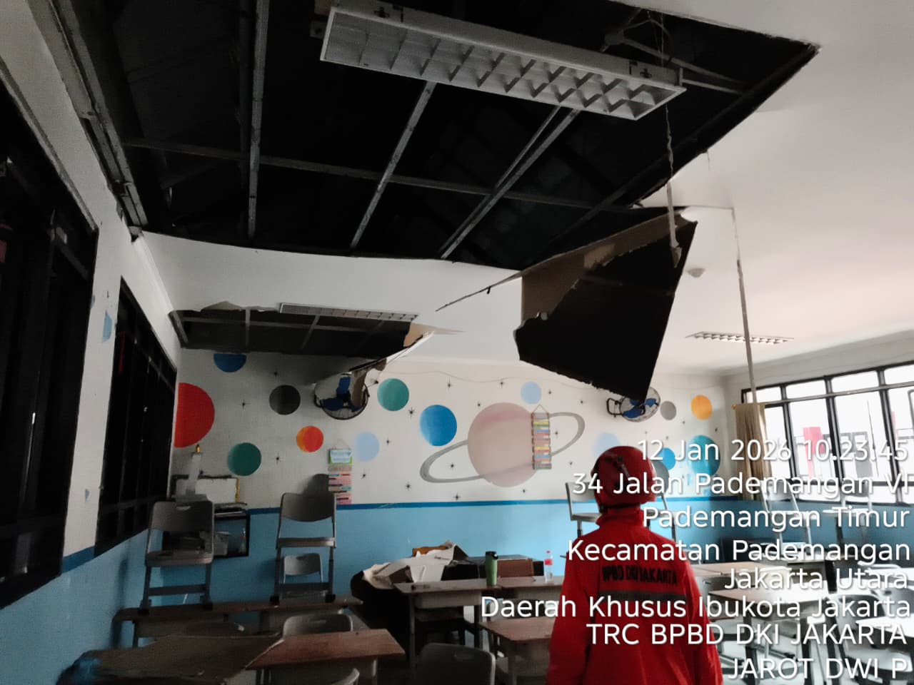 Cuaca ekstrem jadi pemicu utama insiden ini. Hujan dengan intensitas sedang hingga lebat mengguyur Jakarta Utara dan merusak struktur atap sekolah.