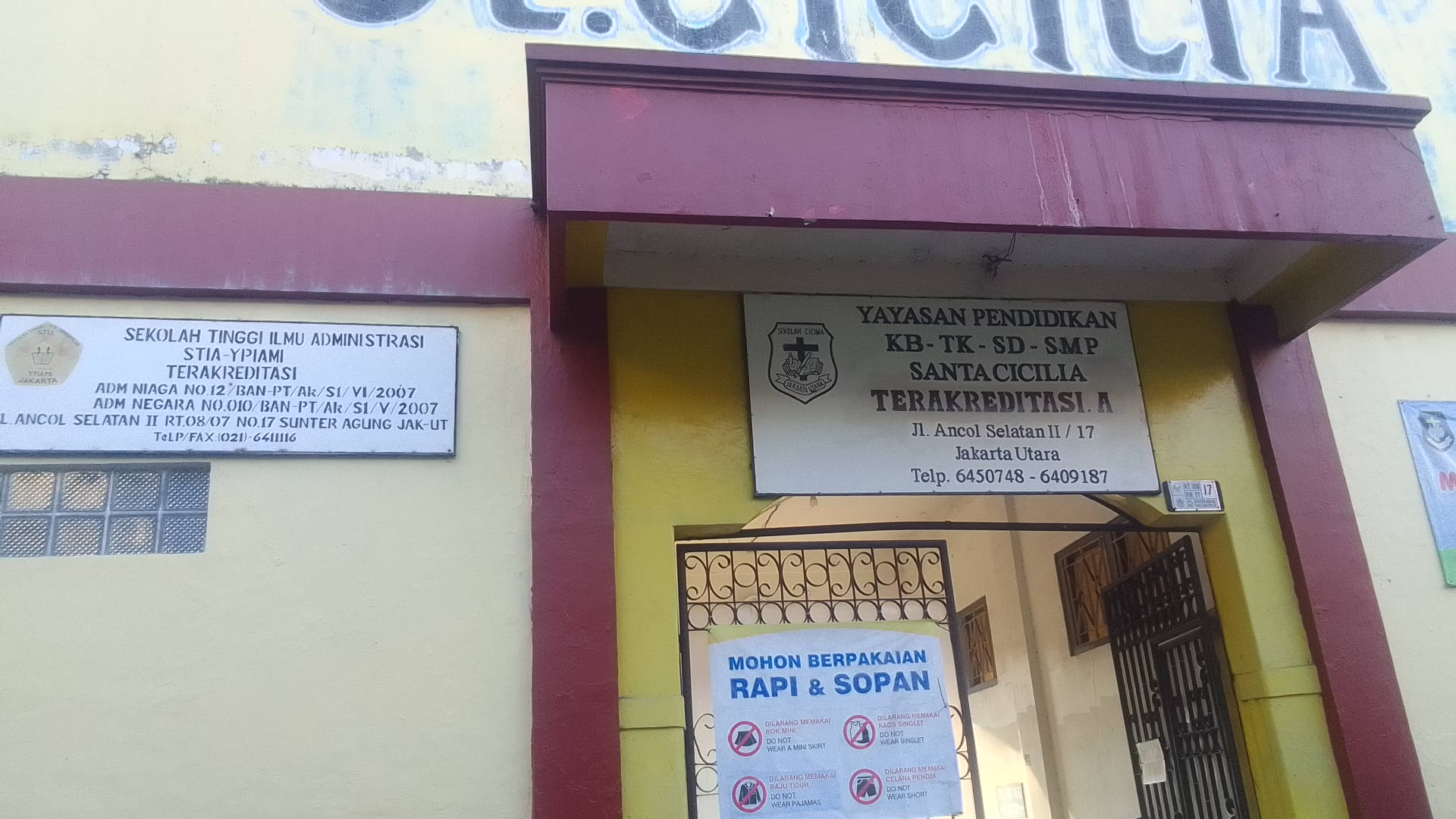 JawaPos.com - Papan nama dari kayu bertuliskan 'Sekolah Tinggi Ilmu Administrasi STIA YPIAMI' masih terpampang di depan gedung sekolah yang papan nama utamanya bertuliskan 'Yayasan Pendidikan KB-TK-SD-SMP Santa Cicila'. Papan nama itu berada di samping kiri papan nama utama tersebut.