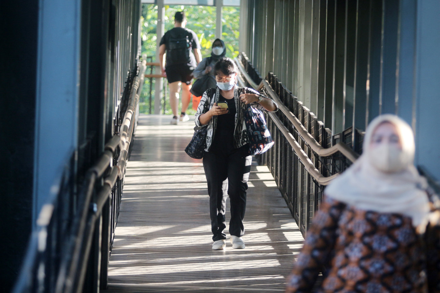 Pejalan kaki melewati trotoar dan pedestrian di Kawasan Jalan Jenderal Sudirman, Senayan, Jakarta Selatan. Para pekerja berjalan kaki melintasi trotoar di Kawasan Berorientasi Transit atau Transit Oriented Development (TOD), Halte Bus TransJakarta Gelora