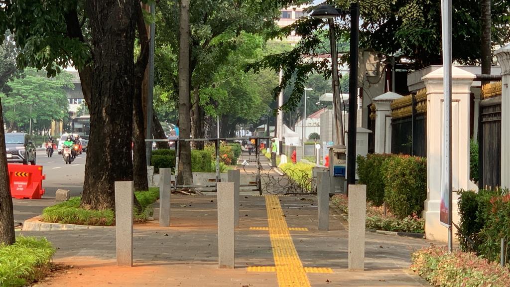 Trotoar yang ditutup dengan kawat berduri di depan Gedung Kedutaan Besar Amerika Serikat di Jalan Merdeka Selatan, Jakarta Pusat.
