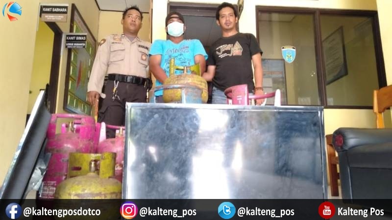 M Rahmad (tengah) beserta barang bukti hasil curiannya diamankan di Polsek Seruyan Hilir, Selasa (23/4). (Kalteng Pos)