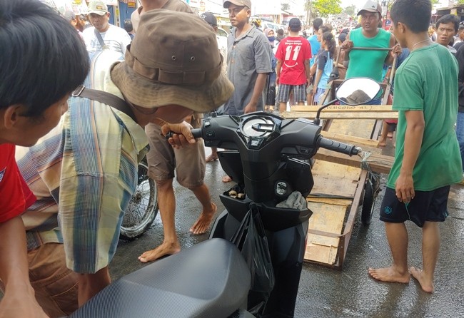 "Ya kita kan saling bantu saja. Ini kita juga basah, dorong berat, di bagi empat upahnya. Selain motor, orang juga kita angkut, Rp 20 ribu sekali nyeberang," tandasnya.