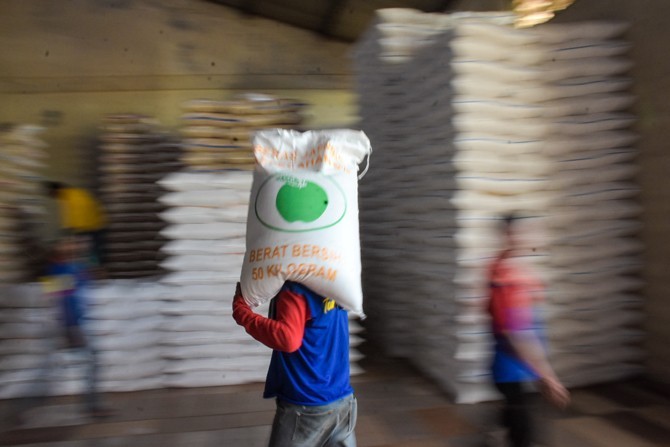 Pekerja memanggul beras di Pasar Beras Induk Cipinang, Jakarta, Minggu (17/5/2020). Pemerintah Indonesia melalui Perum Bulog memastikan bahwa stok beras di seluruh wilayah Indonesia aman hingga perayaan Hari Raya Idul Fitri 1441 H. Foto: Dery Ridwansah/ J