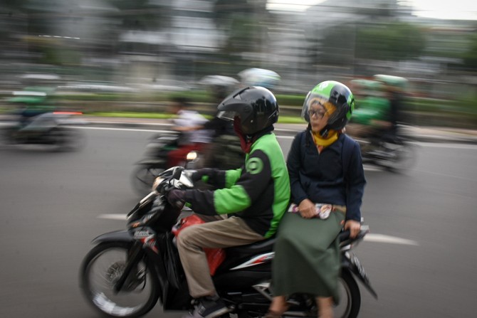 Sejumlah driver ojek online saat mencari order di kawasan Jalan Tentara Pelajar, Jakarta (10/2/2020). Kementerian Perhubungan mengatakan bahwa dalam pembahasan kenaikan tarif ojek online, hanya zona Jabodetabek saja yang akan mengalami kenaikan. Sedangkan