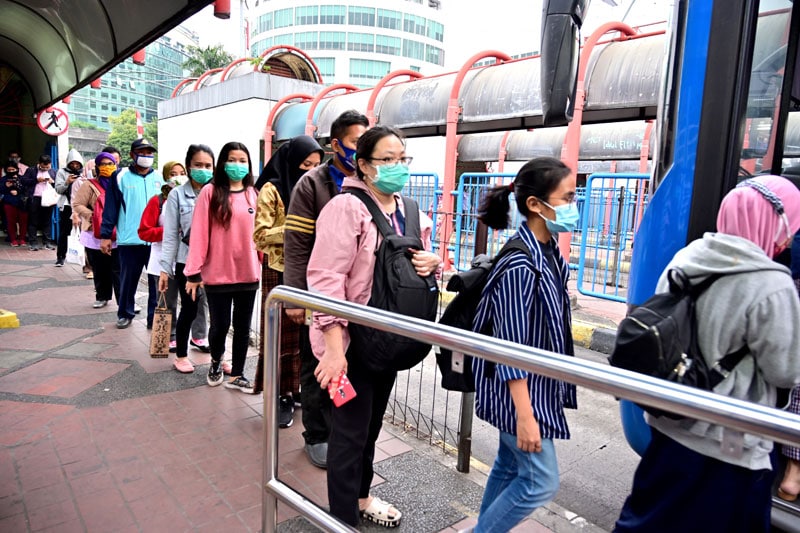 ANIES INJAK REM: Penumpang antre menaiki bus di Terminal Blok M kemarin. Jakrta akan menerapkan pembatasan sosial berskala besar jilid II mulai Senin mendatang (14/9). (ADEK BERRY/AFP)