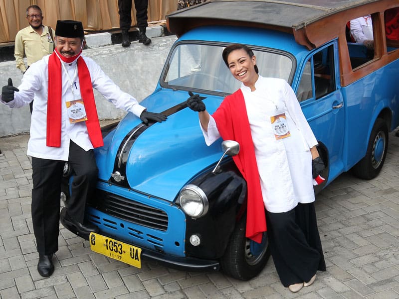 GAYA BETAWI: Muhamad dan Rahayu Saraswati di depan oplet Si Doel setelah menyerahkan berkas pendaftaran ke KPU Tangerang Selatan, Jumat (4/9). (MUHAMAD ALI/JAWA POS)