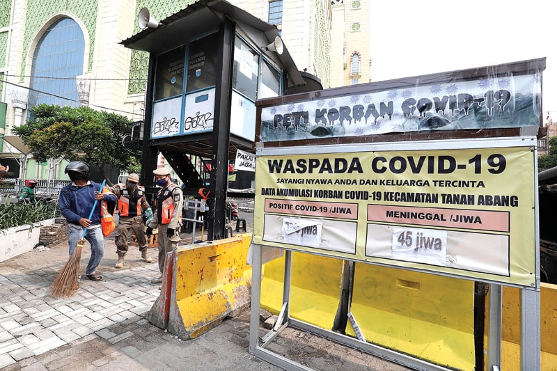 Warga terjaring operasi yustisi Covid-19 disanksi menyapu jalan di kawasan Pasar Tanah Abang, Jakarta, Senin (14/9). (MIFTAHULHAYAT/JAWA POS)