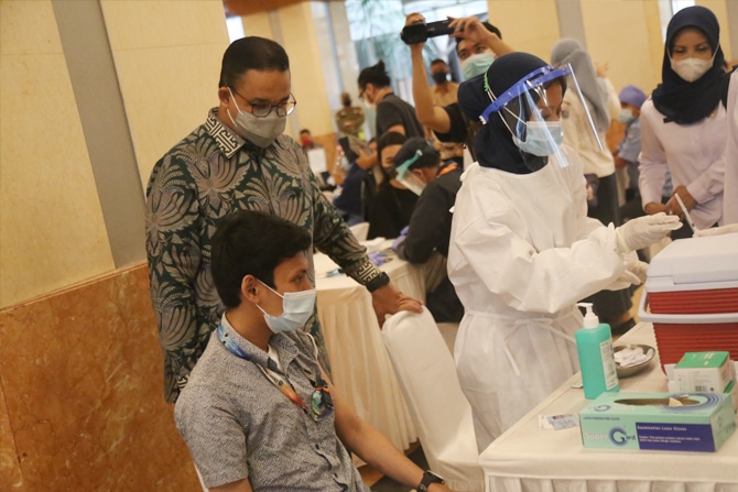 Gubernur DKI Jakarta Anies Baswedan saat meninjau pelaksanaan vaksinasi COVID-19 kepada pegawai dan wartawan di Gedung Balaikota, Jakarta Pusat, Rabu (24/3/2021). Pelaksanaan vaksinasi ini atas kerjasama antara Pemprov DKI Jakarta dengan Dewan Pers. Seban