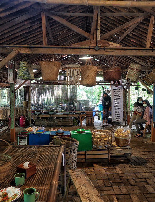 Keunikan konsep warung makan ini yang menjadi daya tarik utama. Tempat duduk yang disediakan berupa lesehan dengan bangunan berupa saung atau gazebo dari bambu. Ditambah pepohonan yang rindang di sekeliling warung makan. Suasana itu membuat para pengunjung menjadi nyaman dan santai.