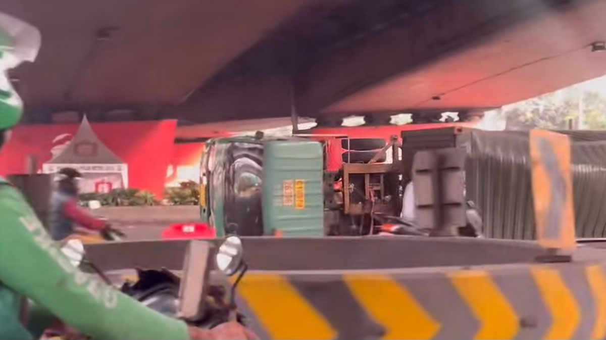 Tangkapan layar video viral kecelakaan truk kontainer terguling di lampu merah Tomang, Jakarta Barat, Rabu (12/2). (@infojkt24)